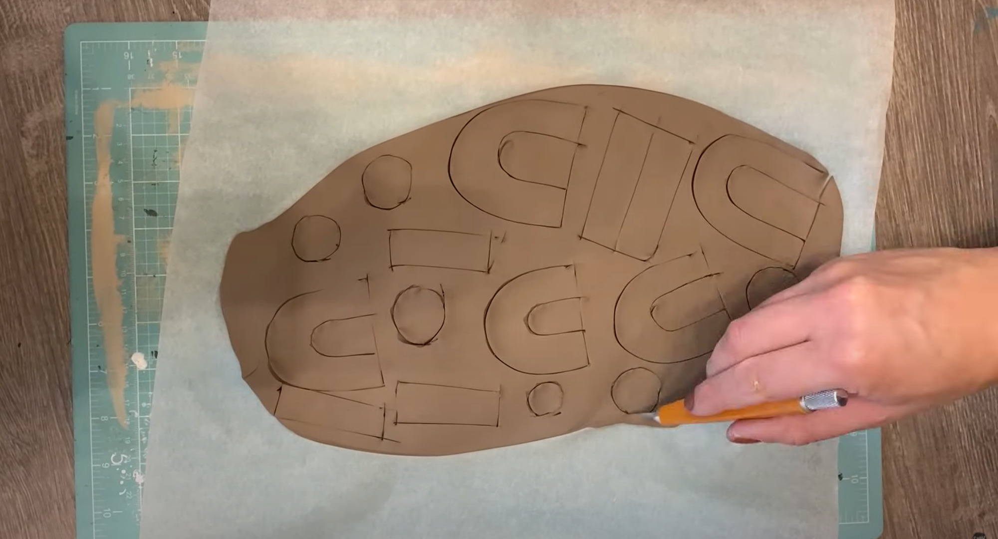 - Roll your clay out on the parchment paper, and then use either a knife to cut shapes free-hand for an organic look, or use cookie cutters if you want to be more precise and less abstract.