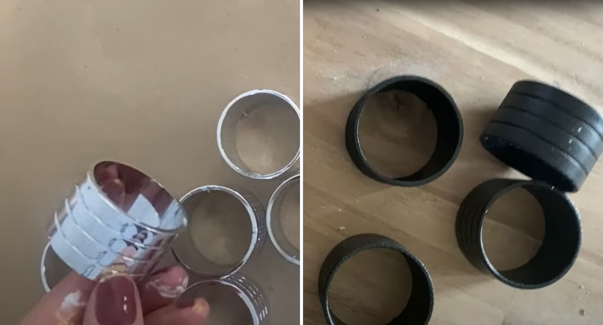 All you need is a package of the silver napkin rings you can find down the wedding aisle of the dollar store, and a black satin finish spray paint. The rest is self-explanatory! They look so beautiful and modern when painted a satin black, especially with the line details.