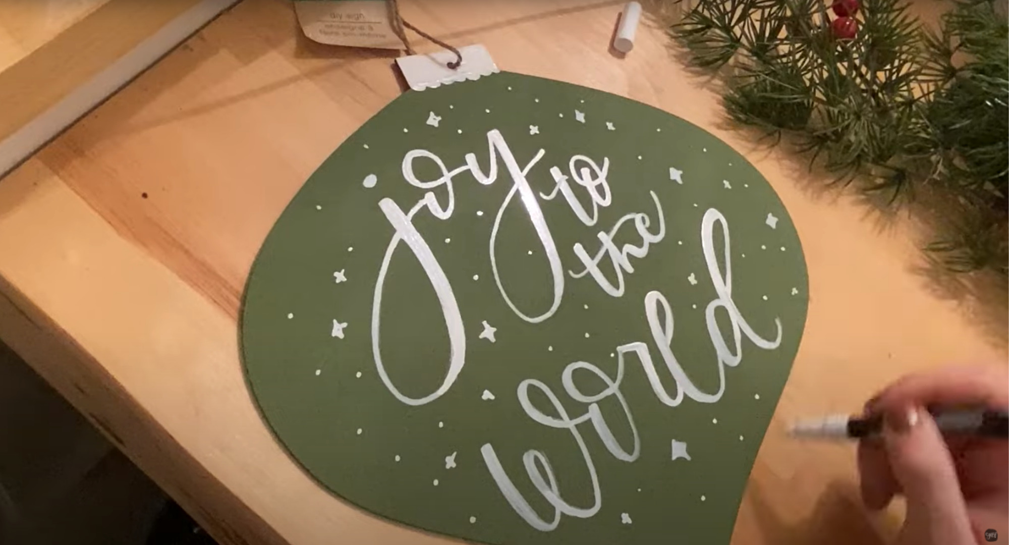 There is something about wood blanks at the dollar store! I just can’t resist bringing them home to make little hand-lettered signs out of them for every season. For this one, you will need an ornament-shaped wood blank, green paint, and a white paint pen.