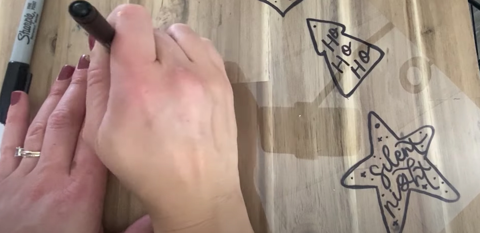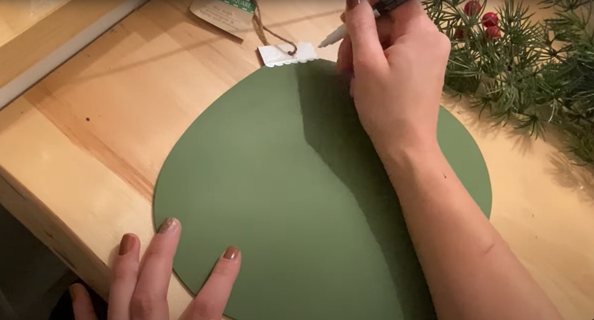 I normally leave my wood signs natural wood because I like that colour, but to make it more festive I chose to paint this ornament green. It took two coats to fully cover it. For the decoration at the top of the ornament and the lettering, I used a Craft Smart paint pen from Michaels. I like acrylic paint markers for most projects on wood since they seem to work the best.