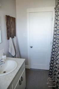 I also sprung for a new basket… Shane always rolls his eyes when I come home with something like a basket. Because we do have a lot. But now that we can’t lock our bathroom cleaners in the bottom cabinet of the vanity, I wanted to be able to have them up and out of the way and cleaners just aren’t pretty. This rope basket from Urban Barn hides them perfectly. AND it has leather detail on the handles. Score. To balance how tall it was, I made this sign- Shane picked the phrase. Would you like to see a DIY tutorial? It was so quick!