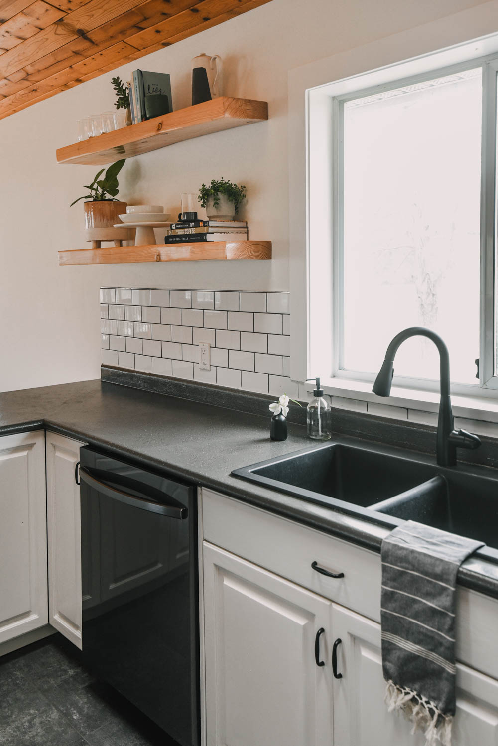 Speaking of countertops… The original countertops are green laminate. While they had some damage, they were mostly just dated. New countertops weren’t in the books for this update, so we spent some time exploring DIY countertop resurfacing kits. They ended up ordering this one and it took two kits to finish the space. While they are just moving in so we don’t know how it will hold up, the reviews on this one are pretty good for durability! In the meantime… it definitely looks beautiful and is such an upgrade from the mint green laminate for this farmhouse kitchen!