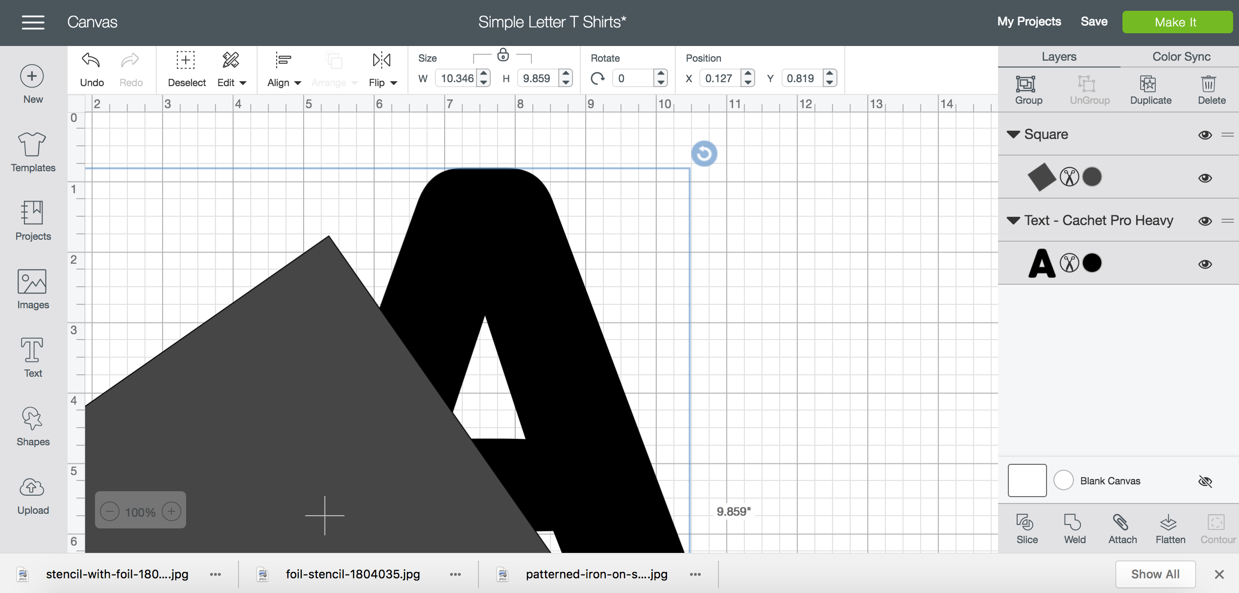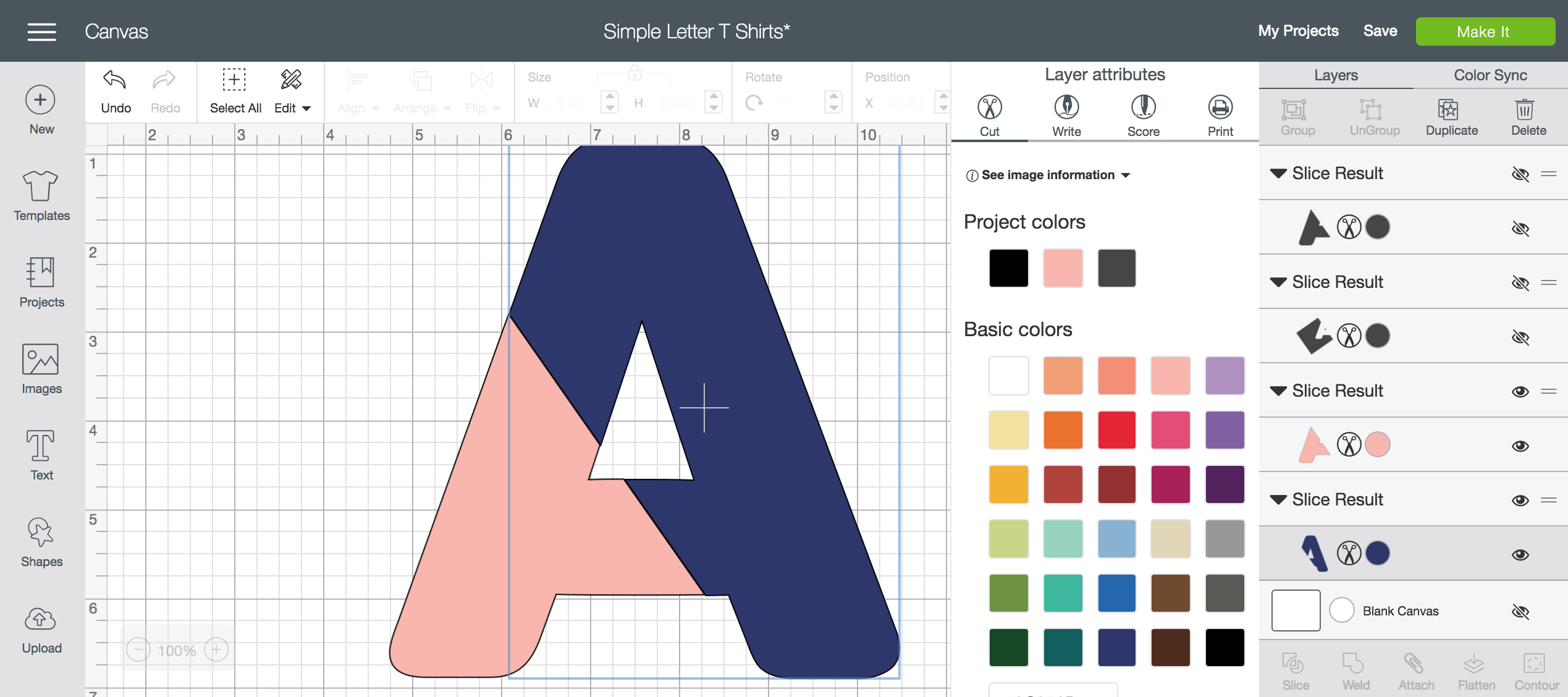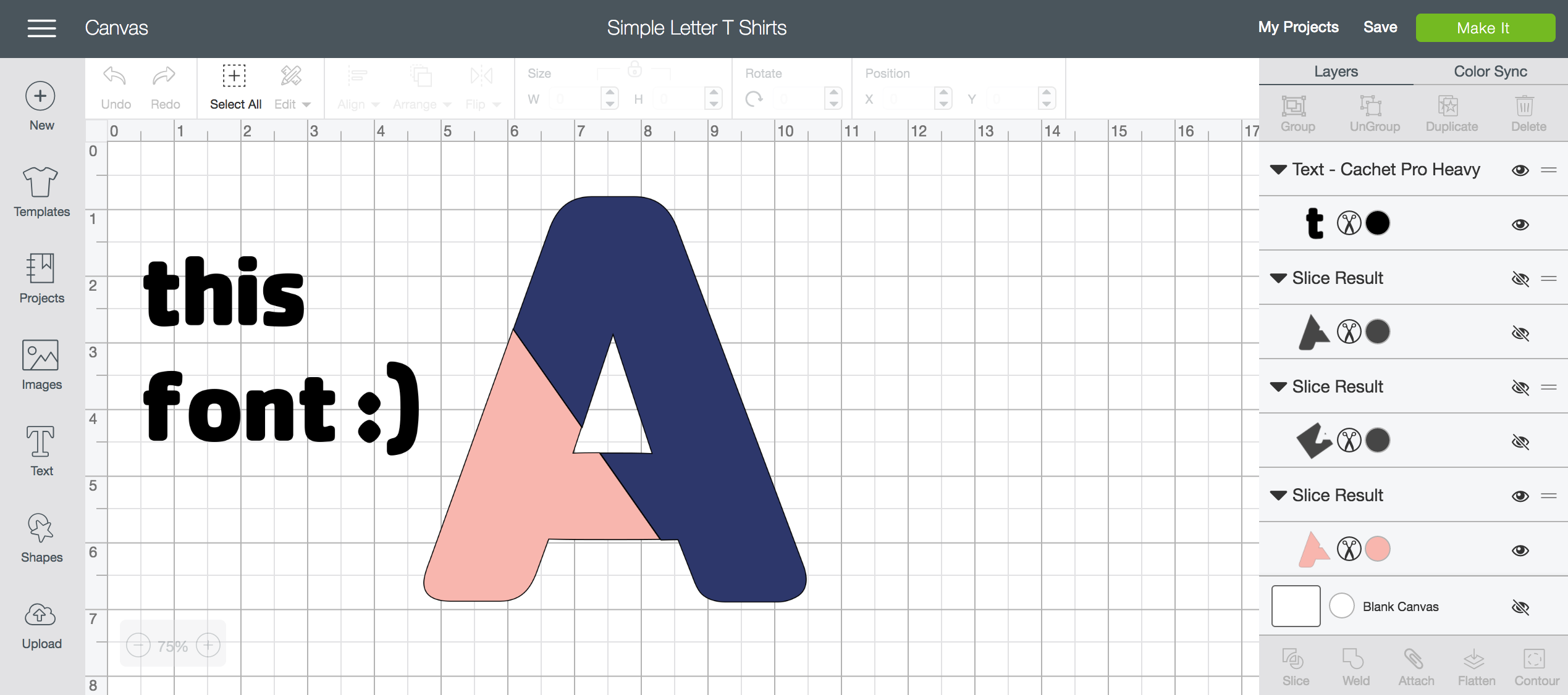 Alright, so the first thing you’ll want to do is open up my project. I’ve got the A in there as an example and a text box with the font I used (Cachet Pro Heavy, included in Cricut Access). Choose your letter and then we can get to slicing it into two colours/patterns!