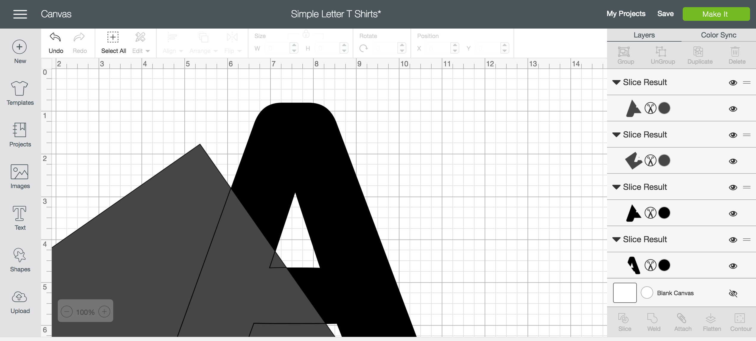 To slice it, make a shape (I used a square) and overlay it on an angle over your letter. Pay attention to where the corners of the shape land. When you’re happy with how that’s overlayed, select both the shape and the letter and click ‘slice’. This will make four layers. Turn off the layers of the shape that’s been sliced and just leave the letter sliced in half.