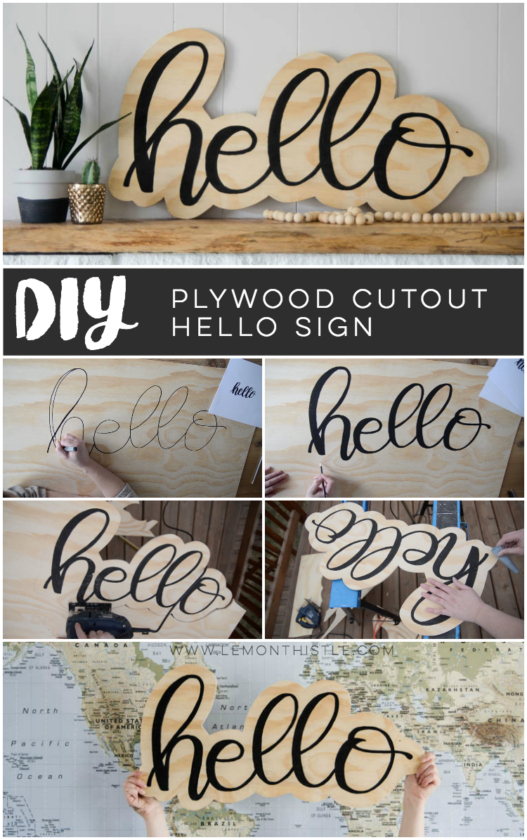 Today I’m excited to be joining up with Remodelaholic again on a challenge. Last time we tackled pallet projects and I made a rad hexagon side table for my deck and this time? We’re talking plywood! Here’s the thing about plywood- I think it got a bad rep for a while. I think we’ve all seen one or two plywood projects in our time that we immediately think of when someone says plywood. BUT I think I’m in the clear to say that plywood is getting cool again! There’s some really rad plywood projects in this challenge but the project that totally inspired this is this ‘YAY’ wall from Vintage Revivals– it’s 3D-esque and so cool. But I thought it would be fun to get the black on plywood cutout look with script lettering but was intimidated by having to map out 3D so this is where we landed!