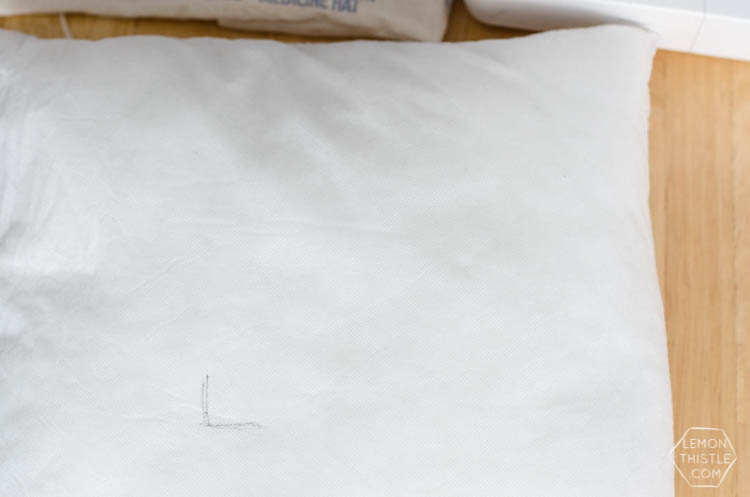 Trim all your threads and turn your pillow cover right way. This is your pillow cover! Admire it…then get to making your pillow form! There are several ways to make a pillow form. I hacked an Ikea pillow form. I took a larger Ikea pillow form and marked the corner of my smaller pillow with pen. Then, I used scissors and cut an inch wider than that mark. Push all the stuffing for your pillow into the corner that is sewn from the larger pillow and sew one edge. Push it all to the other side and sew the other edge. Pillow forms are very delicate material so you’ll want to turn your tension to 1 or 0 on your sewing machine.