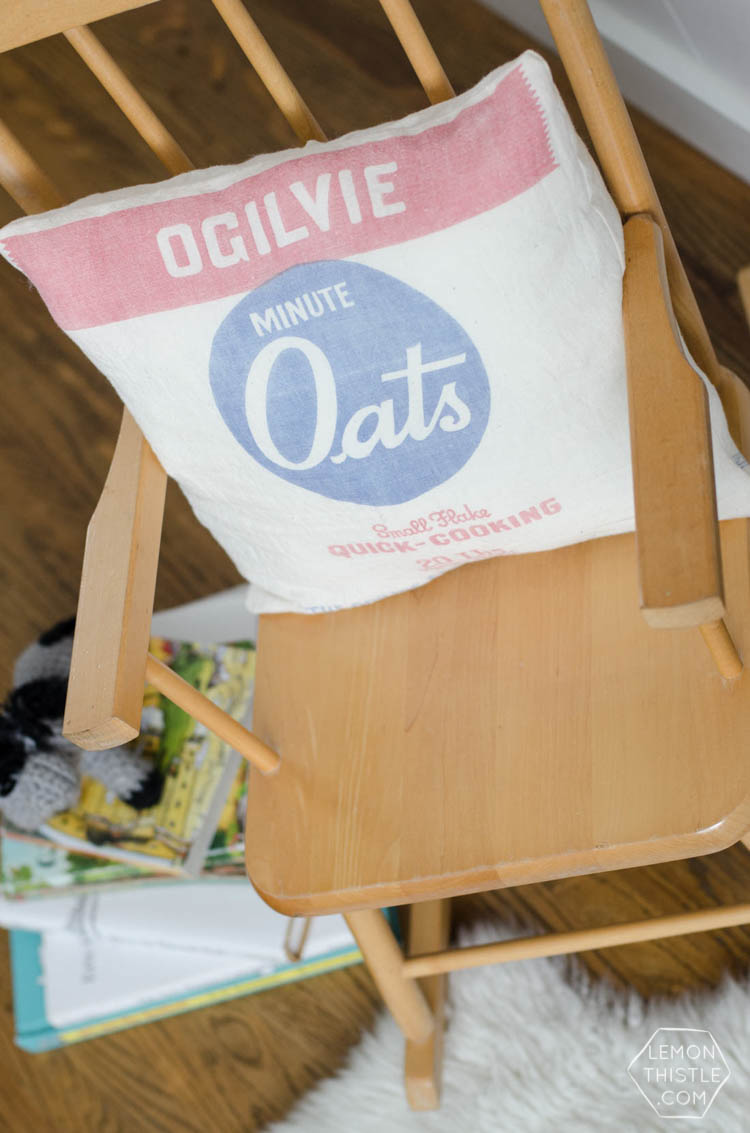 I created this DIY Vintage Grain Sack Pillow a while back for The Little Umbrella and it has been well-loved since. I did make it to have on one of their little rocking chairs, but it really doesn’t stay there, it makes it’s way around the house like musical chairs. The oat sack came home with me a couple years ago now, when I was pregnant from my favourite antique store. I spied it hanging in the rafters and immediately knew what I wanted to do with it. Shortly after I got it home, we packed up to move house and just like most projects in my life it took me a while to get around to it.