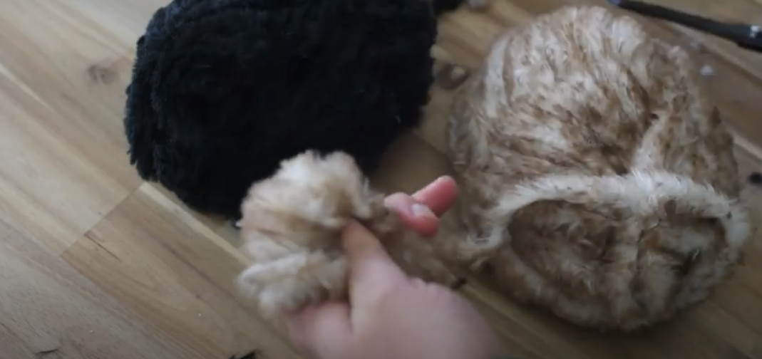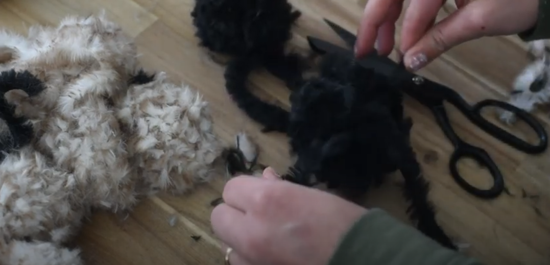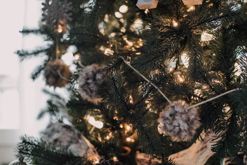 I used a Pom Pom maker but if you don’t have one, you can still make this garland. First, wind the yarn around your hand. Then, slide it off and tie the centre. Now, cut your loops and trim the edges. You’re going to want to do this over and over and over… and over and over and over. The only challenge with this furry yarn is that it was pretty slippery. And messy. I looked like a giant fluffball after this.