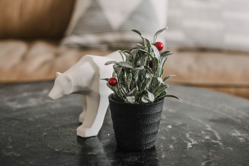 Last but not least, I found this cute little planter at the dollar store with that frosty greenery. The pot was a glossy grey which didn’t have the look that I wanted – you know I love black! To make this more modern and more my style, I spray painted it with Stone Effect Spray Paint but that didn’t have very even coverage, even after several coats… so, I added some black chalk paint on top and I am LOVING how this one turned out! I am definitely going to use these two paints together again.