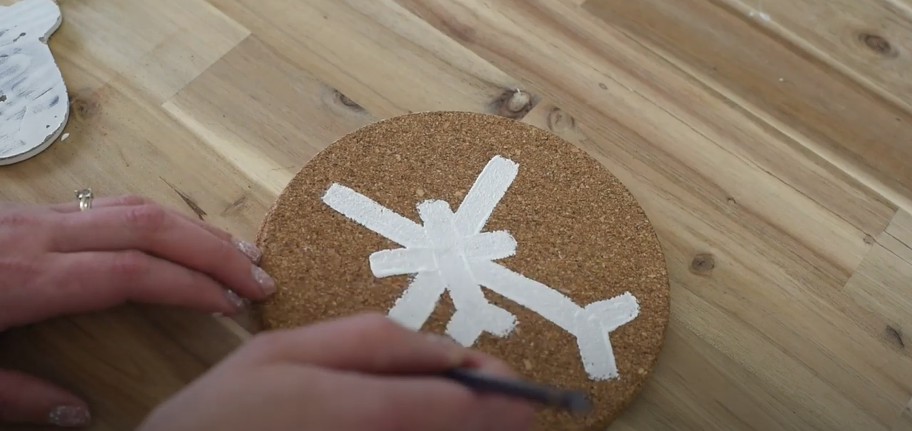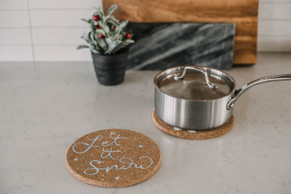 I decorated these inexpensive, dollar store cork trivets two ways. First, I painted snowflakes (using acrylic paint), and then hand lettering with a paint pen. I think they turned out pretty darn cute! I think I’ll stick with my paint pens in the future, but the kids love the snowflake one the most. You can see some other cork trivet ideas (punny ones!) right over here.