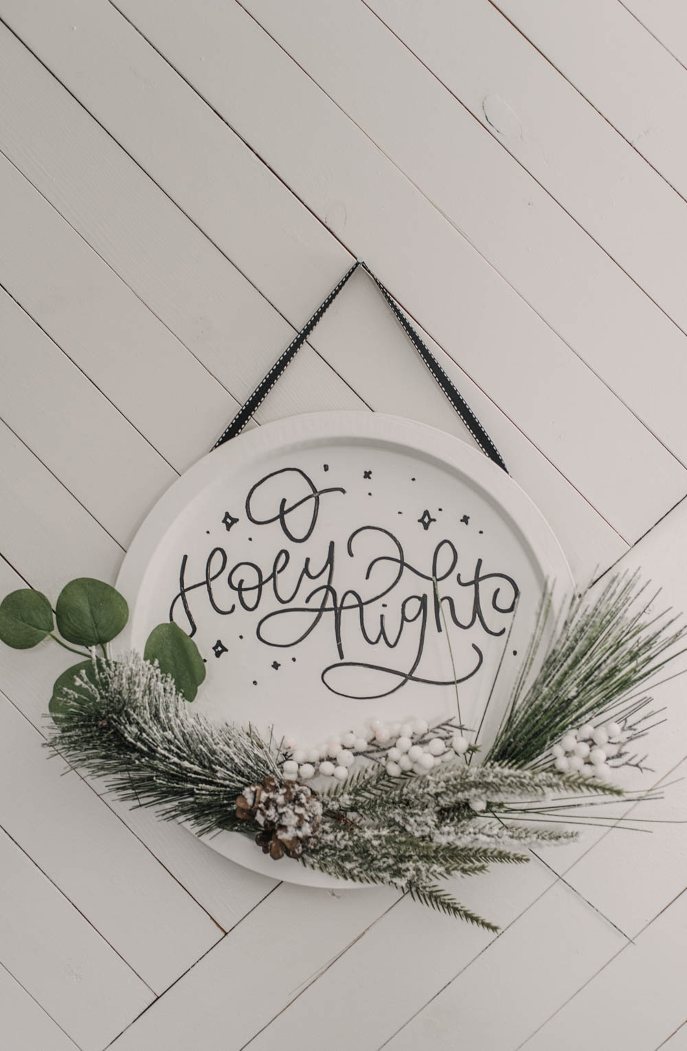Once it’s dry, you’ll write your favourite holiday quote- I chose ‘O Holy Night’ and I just free handed it, but you could totally use a stencil if you like! If you want some tips on hand lettering so you can free hand it too, I have a free Brush Lettering Quickstart Guide right here! I always love to add stars to my holiday designs as well.