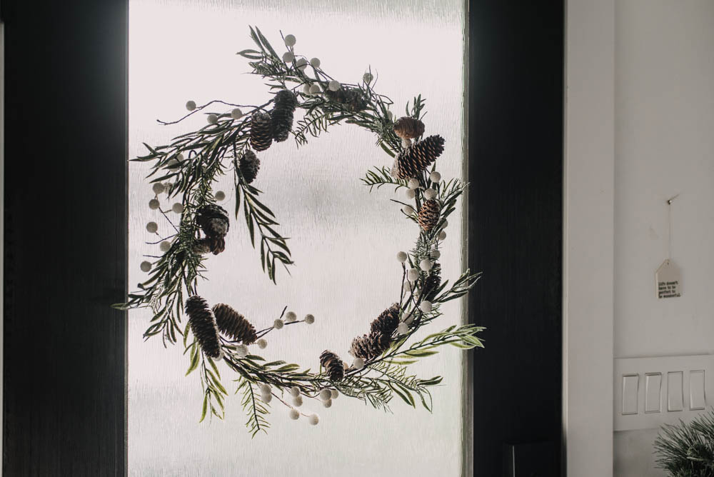I have a love hate relationship with wreaths. I truly love what they add to an entryway but they’re almost always so chunky and huge and for my entryway that’s not idea. My favourite wreath up until now was a minimal one I made using a couple garlands years ago and now this one can join it! Just like that old wreath, I made this wreath out of some inexpensive garlands from the Dollar Store. Three to be exact.
