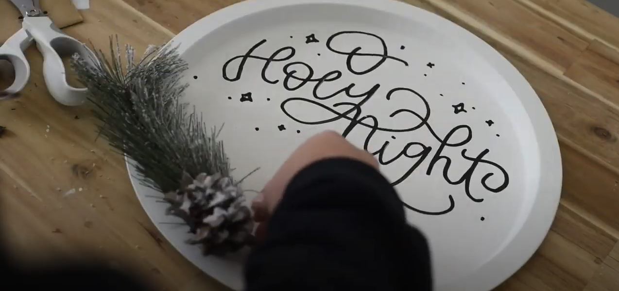 For this DIY Dollar Store Christmas Sign, you’ll need metal serving try, acrylic paint, some greenery, a glue gun, and a paint pen. My friend Christina shared a similar DIY a couple weeks back where she used an aluminum burner cover to make a wall hanging. I loved the creativity so when I spotted this larger snowman cookie tray that was made out of metal, I knew it would make a great sign!
