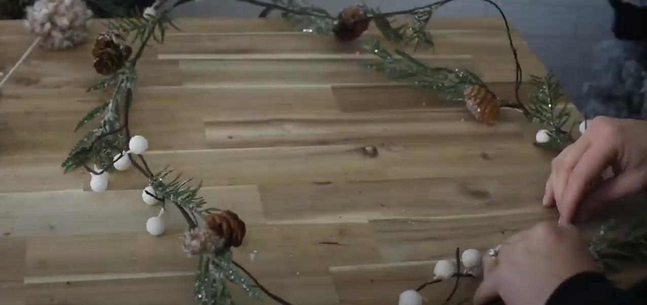 Start by shaping the garlands into the size of wreath that you want. I layered a few garlands to get the fullness that I was looking for and then I wrapped the wired pieces around each other to secure it. I absolutely love how this one turned out, and it cost under $10 to make it!