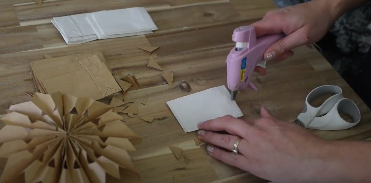 Start by running a bead of hot glue down the centre of each bag, and a line across the bottom just like an upside down T and then glue one on top of the other. Make sure you stack them facing the same direction. Bigger paper bag snowflakes are typically made with 6-8 bags, but for these teeny ones, I found that I needed about 10 paper bags for the size of snowflake that I wanted.