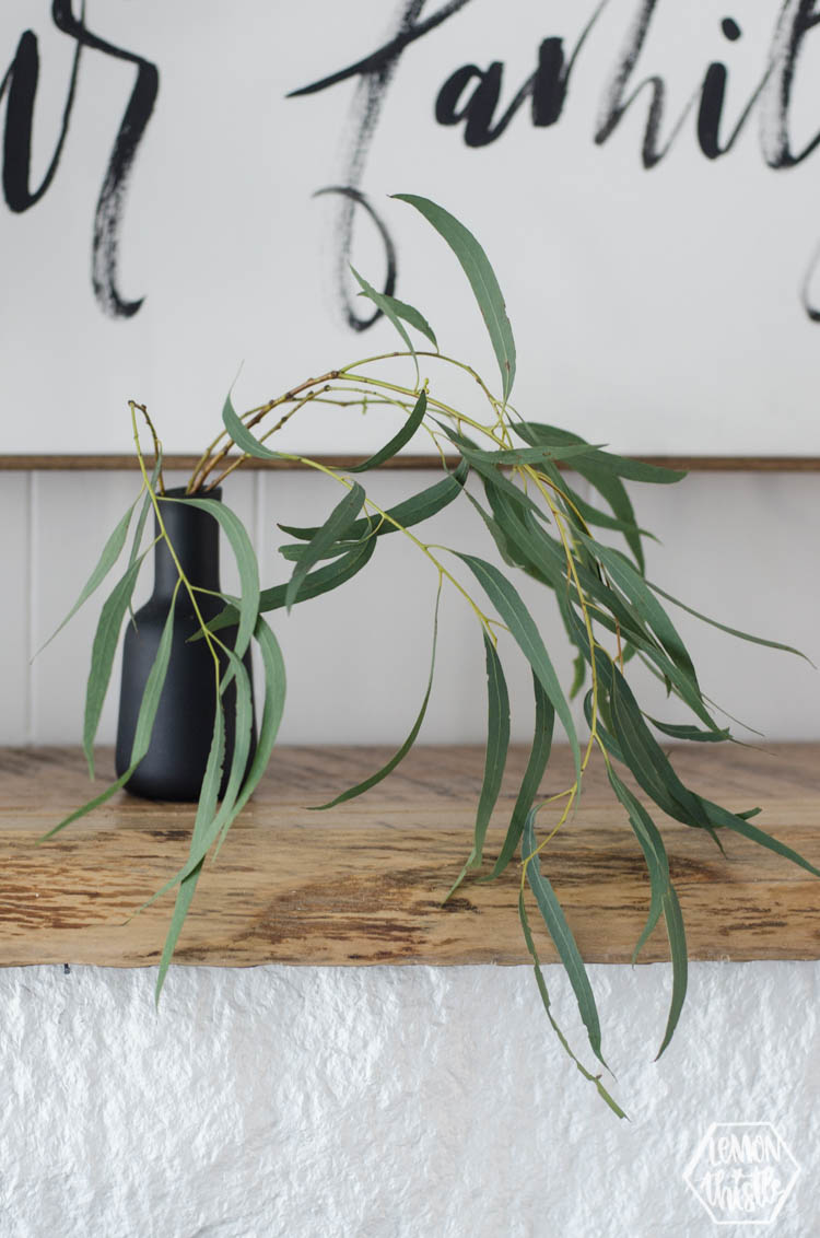 I love using eucalyptus in my home decor. The muted greens and the gorgeous shapes… not to mention the lovely fragrance. I love how it adds texture to simple decor, it looks clean and modern, and it adds life to vignette. I’m all about it. And apparently every one else is too. It’s become hugely popular over the past few years not just for home decor but for weddings and floral arrangements. I’ve actually found the cost of eucalyptus has gone up around here. But even still- it’s pretty budget friendly if you use it intentionally (especially compared to fresh flowers!) and it will be a staple in our home decor until I find something I love more. Which I don’t see happening any time soon.