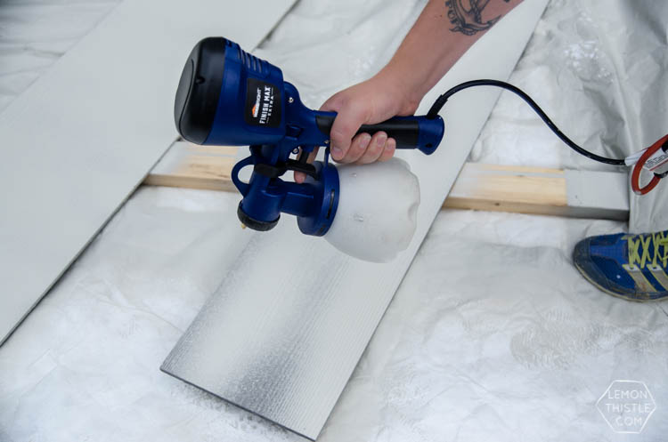 We used vapour barrier instead of dropcloth (who has THAT MUCH DROP CLOTH) and I partnered with HomeRight to upgrade my paint sprayer. They sent me their Finish Max Extra and it was perfect for the job. Now, I totally loved my smaller sprayer but you did have to thin down thick paint to use it.