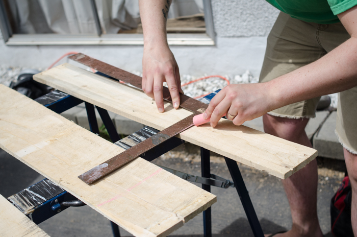 Next I laid out the pieces I wanted to use to make the frame and marked where they needed to be cut. Hubby used a square to straighten my lines while Em and I watched from a distance (that little guy loves anything with a motor so watching Daddy with the saw was exciting). The dots on the chalkboard are rain- but since we’re last minute DIYers, we pressed on (because we had no choice).