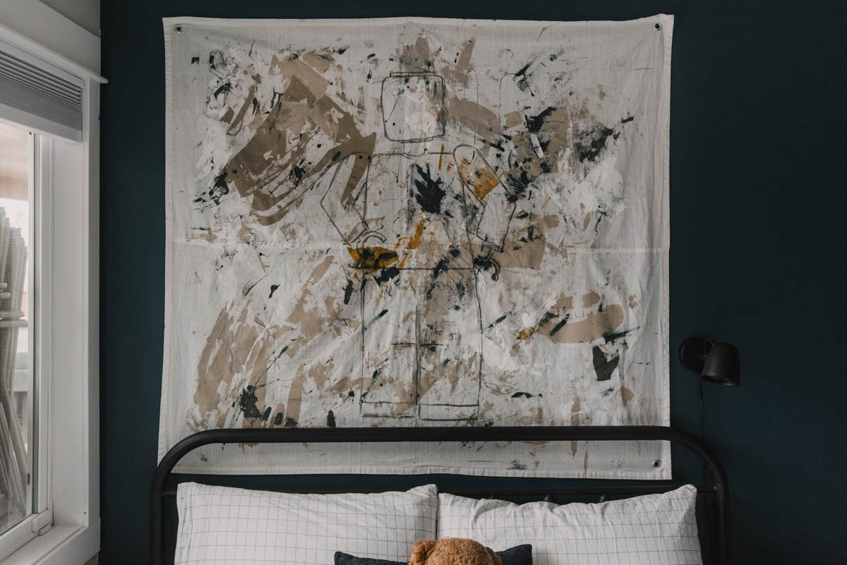 After that was totally dry, we went in and illustrated a line art lego man. We did this free hand and used oil pastels from our kids art kit. I love how easily the oil pastels drew on fabric and we were able to make it darker or lighter just with pressure. Any line art design would look beautiful on top of an abstract painting like this. I’m imagining a line art silhouette or florals over some blush and tan abstract painting- wouldn’t that be lovely?