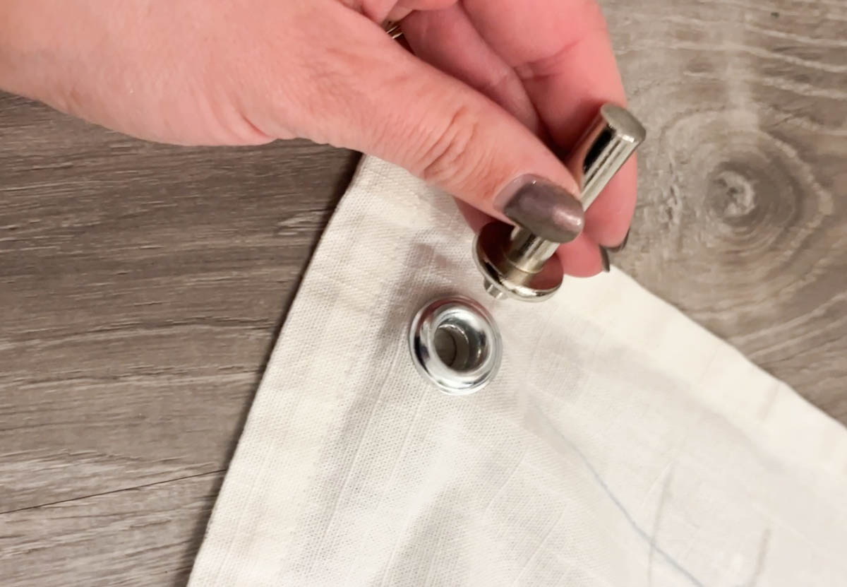To add a grommet, you need to buy large grommets and a grommet setting tool. You can get both in this set here. You just line up your grommets on the tool and layer your fabric in between the pieces, setting them in with a hammer. It’s like magic, really. My 9 year old son helped me set them in his lego man wall flag, I promise- it’s pretty simple :)