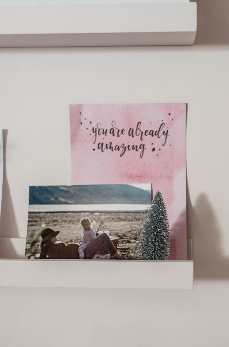 I’ve said in almost every single one of my home tours in the past (you know… when I did full home tours, back before this remodel!) that I LOVE letterboards and chalkboards because they are always the same style but easy to make seasonal just by changing up the phrase. I was also planning to switch out some of the art on her ledge for some festive art, but decided to photograph it before she got home from school to make some art because making art makes mess and I’d already cleaned the room. You can’t win them all… right?! Festive art to come ;) Other than that, we sprinkled a couple ornaments throughout the room. On her shelves, on the window ledge (the boys and I made those clothespins ones as a surprise for her- boys love using their ‘super hulk strength’ to break clothespins apart), hanging off picture frames, and leaning on the nightstand… I mean, put an ornament anywhere you can because it’s festive, okay?!