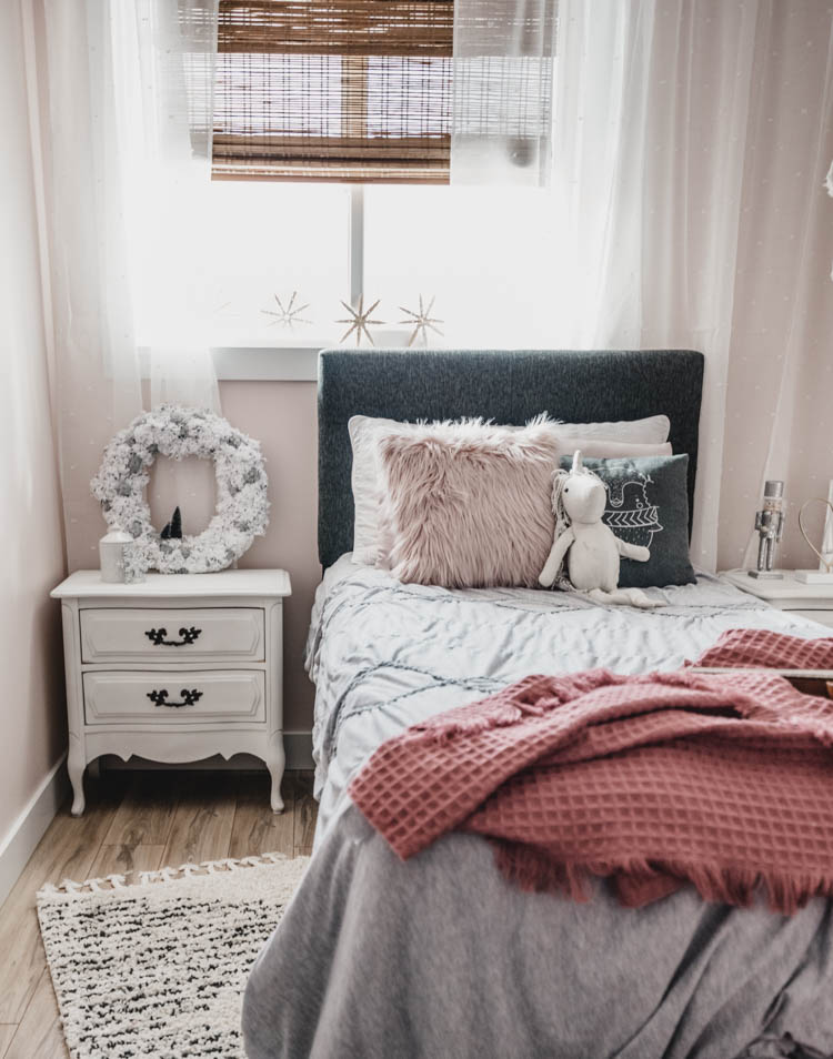 Today I’m so excited to be joining in on another home tour. And like Monday (I shared my mantel!), I’m not sharing much of my home… because it’s under construction ;) BUT we finished Aubrey’s bedroom for the fall One Room Challenge so it was exciting for her (and me!) to decorate a little girls bedroom for the holidays for the first time ever. If you didn’t catch Aubrey’s room reveal, you can check that out right here– but this is the first time she’s ever not shared with her brothers (she’s a boy/girl twin) so has always had gender neutral bedrooms and decor. The biggest thing she wanted was pink and we ran with that all the way to the Christmas section. This actually was really easy to pull together and cost hardly anything. That’s the awesome thing about moving to a new house is you have no ‘but that goes HERE every year’ issue with moving decor into new rooms. This room tour is part of the Seasonal Simplicity Christmas series of home tours that my lovely friend Krista from The Happy Housie hosts. You can find all the beautiful homes and rooms in the series at the bottom of this post. So if pink ain’t your thing… scroll, baby, scroll ;)