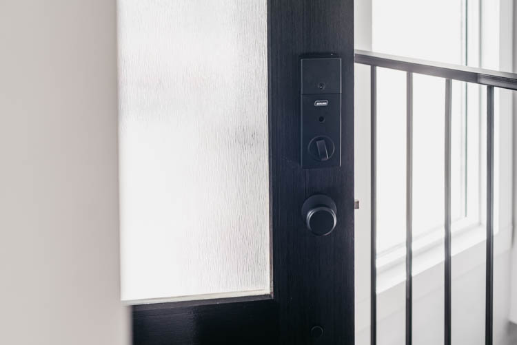 Our entry way is coming along so nicely and I can’t wait to share the whole thing with you guys! If you remember what it looked like before, this is SUCH a big change! We are waiting on the rest of the stair rail to be powder coated and then we can install it and I can share this space – its’ going to be so good! Today I’m joining forces with the Modern Handmade Home girls and Schlage Canada and I’m sharing how we installed our new Schlage Sense smart lock and why we chose it. I’m not going to lie… this is a total game changer for us. Some upgrades are functional but not too exciting, but this is so exciting for me.