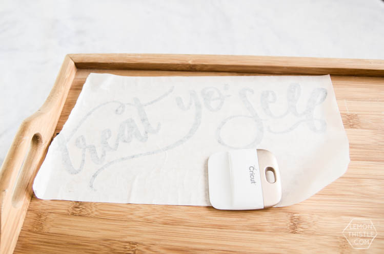 Once you have your decal on your transfer tape, line it up and lay it on your surface. Smooth it really well (you can use a scraper if you like!) and then peel back your transfer paper.