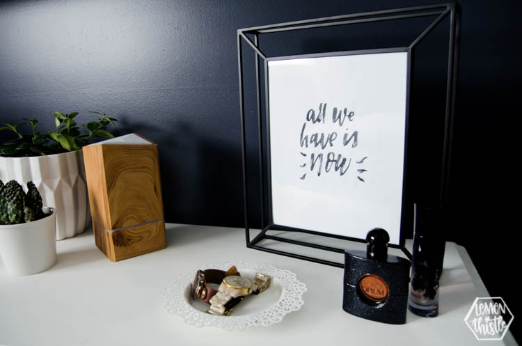 Last but not least is that black geometric photo frame- I love that it’s freestanding for this space. I’d tried leaning things against the wall but it was just so awkward there. This one is perfect for the space… now I just have to find something to take it’s place on our shelves downstairs ;) I made up this brush lettered piece when I decided the frame should go there. I will probably replace it with something I love more down the road, but for now- it fills the space and I love the graphic black and white!
