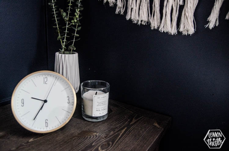 On my nightstand, I have a vase of eucalyptus… it just smells SO GOOD! And I have my clock and a candle that I love to burn when I’m up nursing or working at night. That’s another thing big drawers are good for… lighters- ha! The macrame wall hanging was a DIY of mine that I didn’t make a tutorial for. I just thought there are 1 million and 1 tutorials for macrame out there and video is the best way to learn. Since making it… I’ve obviously been making a lot more videos so maybe now I would take on a tutorial for that… would you guys be interested in that? In other news… this is the darkest corner and was so hard to photograph. But s’okay, no? And my pretty little clock. I actually love going to sleep to the sound of the tick tock. But if that’s not your thing, you wouldn’t like this one ;)