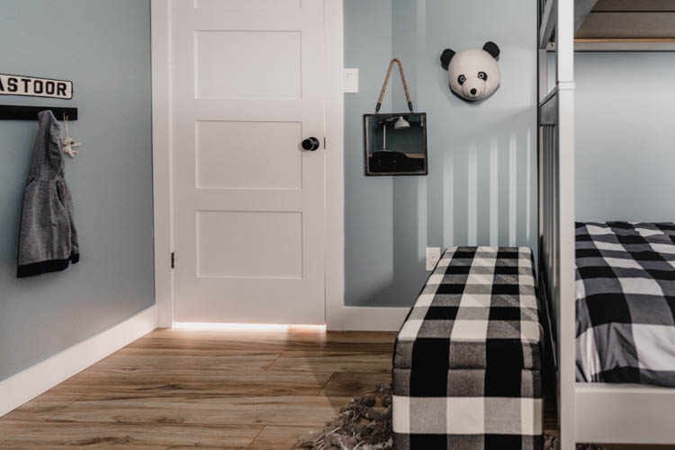 One of the things that we don’t keep in the closet is kids jackets- I just have one sweater on here right now to make it more pretty for photos, but these little hooks are easy for the kids to use each day and tuck nicely behind their door. That ‘Pastoor’ jersey name is such a sweet little sentimental nod that totally suits the style of the room. Shane’s grandma passed away earlier this year and this is something she had saved from one of the boys (Shane or his brothers) hockey jerseys as a kid. We’re grateful to have that bit of memory in the boys room now.