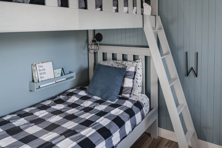 While we’re talking bunk beds… NIGHTSTANDS?! They’re such a challenge. My boys have been sleeping with their water bottles in their beds because they haven’t had nightstands here. In the last house, we’d mounted little floating shelves for their nightstands. We opted for these sweet little wall shelves this time around. Walnut Hollow sent them to us and we painted them out the wall colour. They’re perfect for a few books and then they can put their water bottle there at bedtime too.