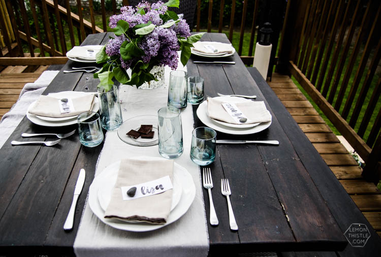 All the glassware and cutlery is our every day dinnerware. One day I’ll have patio dishes but for now- these work and they’re not precious to us if they get dropped or left out in the weather. One thing I like to do to dress up the basic dishes is use a cloth napkin and place card. We bought a pile of these linen look cloth napkins for our Friendsgiving a few years back and they get put to work whenever we have company. Not only is it a bit fancier than paper napkins, but they hide all the nicks and marks on the dishes as well. I just used a brush and ink to letter the place cards and grabbed a few rocks from the garden to keep them from blowing away in the wind.