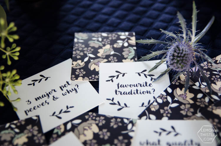I may have gone a little overboard (as I often do) and made 36 of these! So you won’t run out of conversation aaaaalll night. Some of my favourite conversation starters from the bunch? ‘Dream Job’, ‘Best prank you’ve ever pulled’ and ‘celebrity crush’. Download and print them right here!