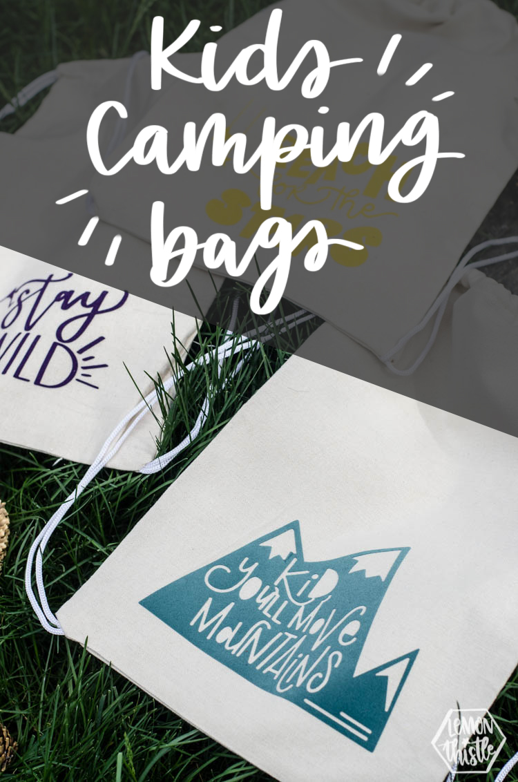 It’s that time again! Another Fresh Cut SVG Bundle is out and this month’s theme is Outdoor & Camping! I hand lettered these sweet quotes with an outdoor vibe that are perfect for kids projects. I’m totally loving how they play for nursery decor, kids shirts or whatever else you can dream up. Today I’m going to share two projects I’ve made using the three designs I contributed to the bundle. The first is this rad wood veneer sign that reads, ‘Kid, you’ll move mountains’. I am really loving how the bold black plays off of the natural wood on this one! The second project? Camping bags! Camping sacks? Draw string back packs for camping. Whatever you call them, they’re cute and really easy thanks to these SVG files! There are so many rad designs in the bundle this time around this time around, you guys! I’m loving the campers and s’mores and all those cute trees. You can get the bundle RIGHT HERE.